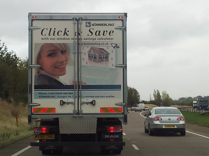 Imagine then, my surprise, when I was driving down the A50 out of Uttoxeter and I saw her on the back of a lorry. Someone else's lorry. The face of DP touting for a double glazing company?